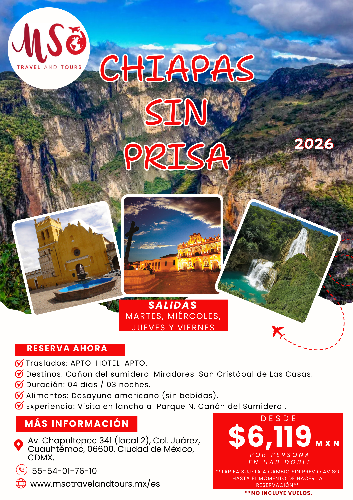 Día 01: CDMX - TUXTLA GUTIÉRREZ - CAÑON DEL SUMIDERO - MIRADORES - SAN CRISTÓBAL DE LAS CASAS