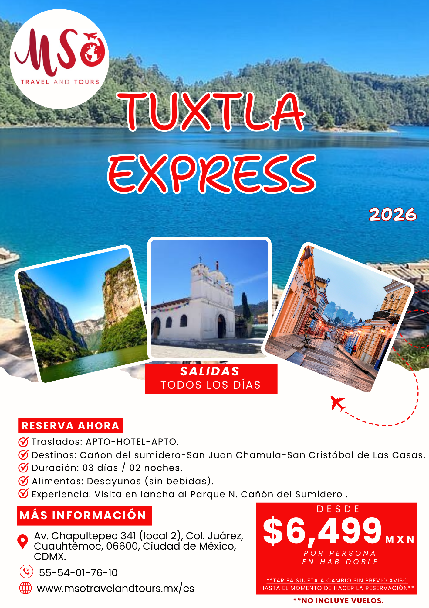 El vuelo de salida de Tuxtla Gutiérrez debe ser después de las 18:00 Hrs. (el termino en el Apto de Tuxtla será 16:30 hrs.)