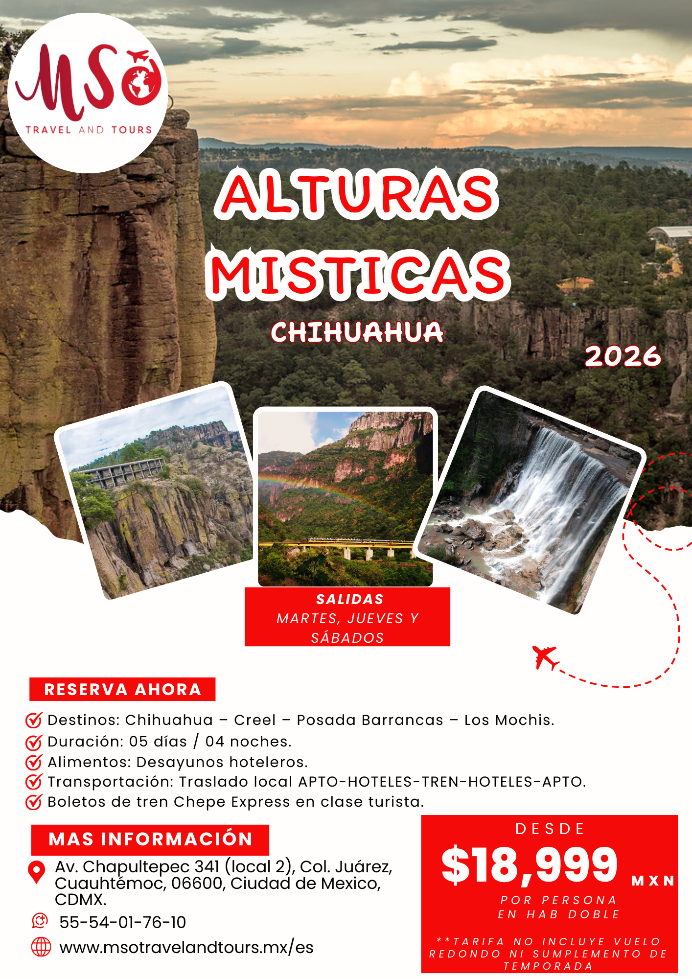 DESTINOS: CHIHUAHUA – CREEL – POSADA BARRANCAS – LOS MOCHIS.
