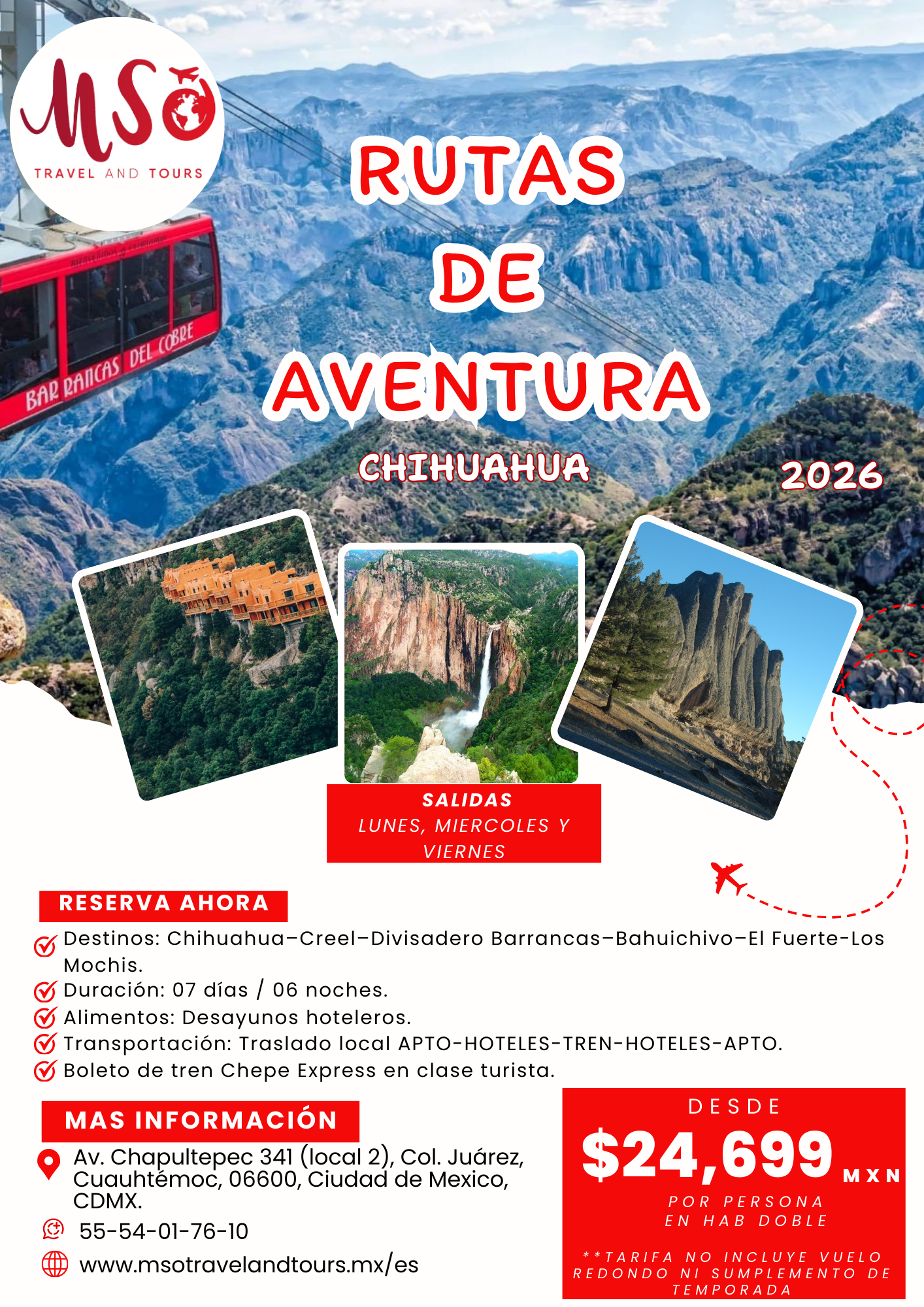 DESTINOS: CHIHUAHUA – CREEL – DIVISADERO BARRANCAS – BAHUICHIVO – EL FUERTE - LOS MOCHIS.