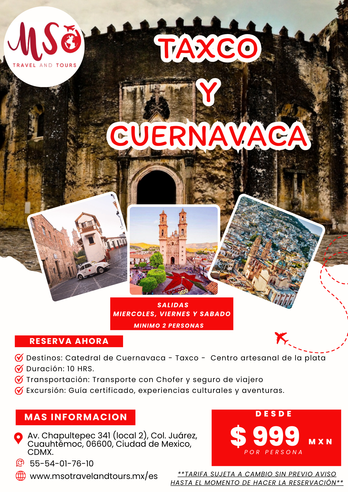 AHORA, SIÉNTATE Y DISFRUTA DEL PAISAJE MIENTRAS CONTINUAMOS HACIA TAXCO. ESTA PEQUEÑA CIUDAD, CON SUS CALLES EMPEDRADAS, PLAZAS SOMBREADAS Y MERCADOS VIBRANTES, FUE EN SU DÍA CONOCIDA EN TODO EL MUNDO COMO LA CIUDAD DE LA PLATA. AQUÍ VISITAREMOS UNA MINA DE PLATA Y APRENDEREMOS CÓMO SE HACEN LAS DIFERENTES ALEACIONES. DESPUÉS DEL ALMUERZO HABRÁ TIEMPO DE SOBRA PARA EXPLORAR ESTA ANIMADA CIUDAD Y PODRÁS ADQUIRIR ALGUNAS DE LAS PRECIOSAS JOYAS Y ARTESANÍAS DE MÉXICO ANTES DE SUBIR AL AUTOBÚS QUE TE LLEVARÁ DE REGRESO A CIUDAD DE MÉXICO.