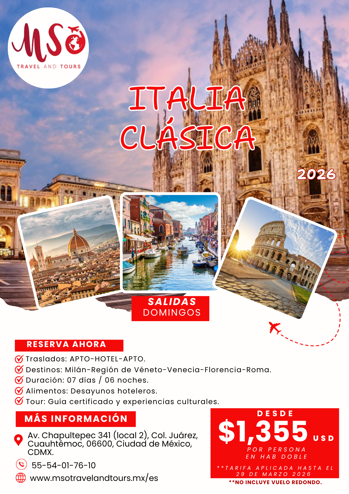 Desayuno. Entraremos a Venecia realizando un paseo panorámico en barco, donde podremos ver la iglesia de Santa María della Salute, la isla de San Giorgio y la Aduana, entre otros. Desembarque. Continuaremos caminando junto al majestuoso exterior del Palacio de los Dogos y la Piazzeta, lugar de acceso a la Piazza San Marco y visitaremos una fábrica de cristal de Murano. Tiempo libre. Si lo deseas, podrás hacer la excursión opcional “Góndolas con Venecia Escondida”, una de las experiencias más especiales que tendrás en Italia. Darás un paseo de la mano de un guía local por algunas de sus plazas, callecitas estrechas, palacios y canales, donde encontrarás infinitos detalles que hacen que Venecia sea una ciudad única en el mundo y, como broche de oro, darás un romántico paseo en góndola para conocer los canales más pintorescos de la ciudad. A la hora indicada, tomaremos el vaporetto hasta el Tronchetto y continuaremos en autobús hasta llegar a nuestro hotel en Florencia, capital de la Toscana, cuna del Renacimiento y hoy en día uno de los principales centros artísticos del mundo. Alojamiento.