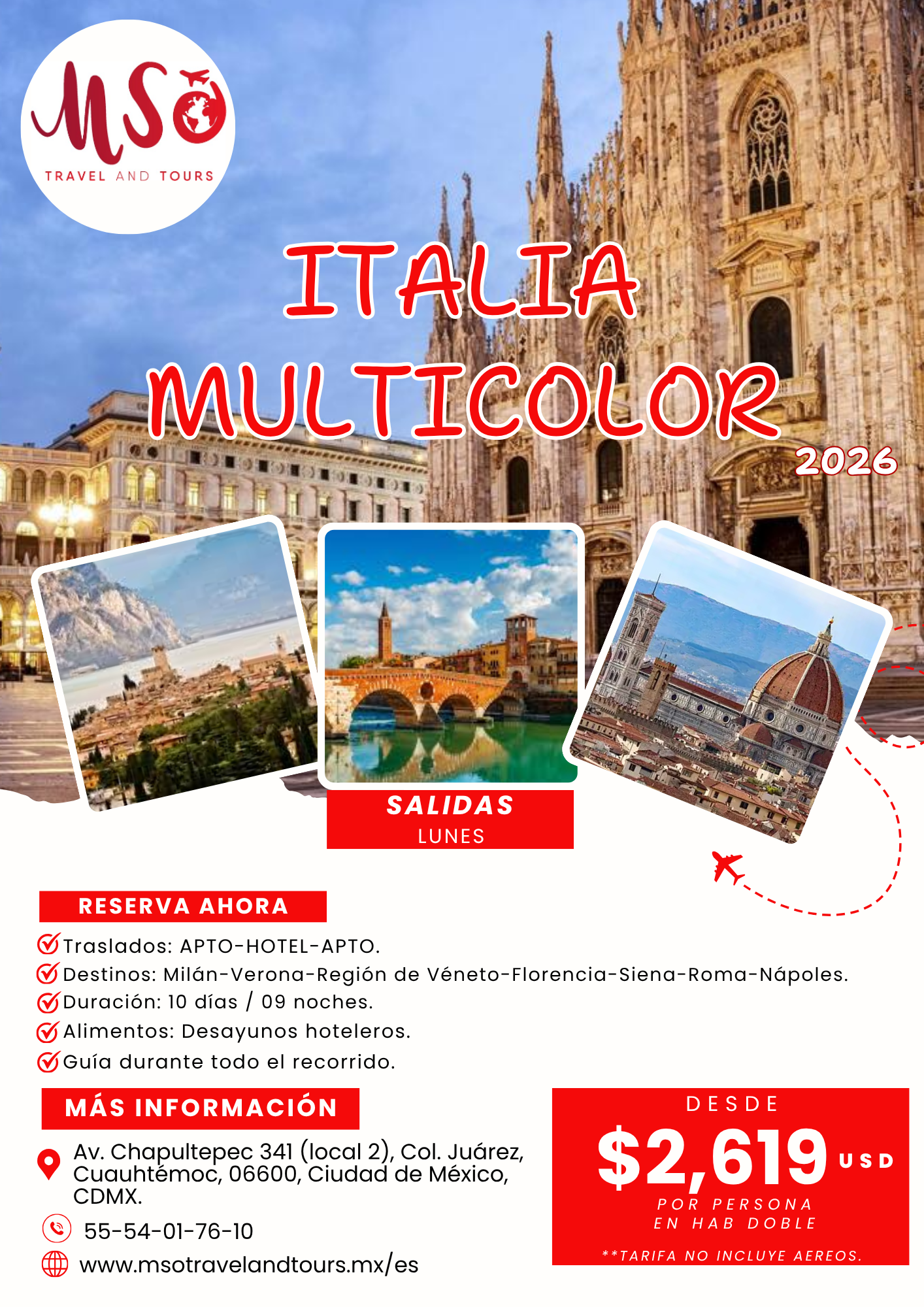 Desayuno. Salida para realizar una visita panorámica, en la que acompañados por un guía local pasaremos por el Castello Sforzesco, la vía Dante y la vía Cordusio hasta llegar a las galerías de Víctor Manuel II, punto de reunión de la sociedad milanesa, y terminaremos en la Piazza del Duomo, donde admiraremos el majestuoso exterior de la catedral. Salida hacia Verona, la ciudad inmortalizada por Shakespeare en “Romeo y Julieta”. Tiempo libre para pasear por sus románticas calles y visitar el anfiteatro de la Arena, la Plaza Bra o la Casa de Julieta, con su icónico balcón. Te recomendamos realizar una visita panorámica opcional de la ciudad con guía local para conocer los secretos de esta bellísima ciudad. Continuación hacia el hotel en la Región del Véneto. Cena y alojamiento.