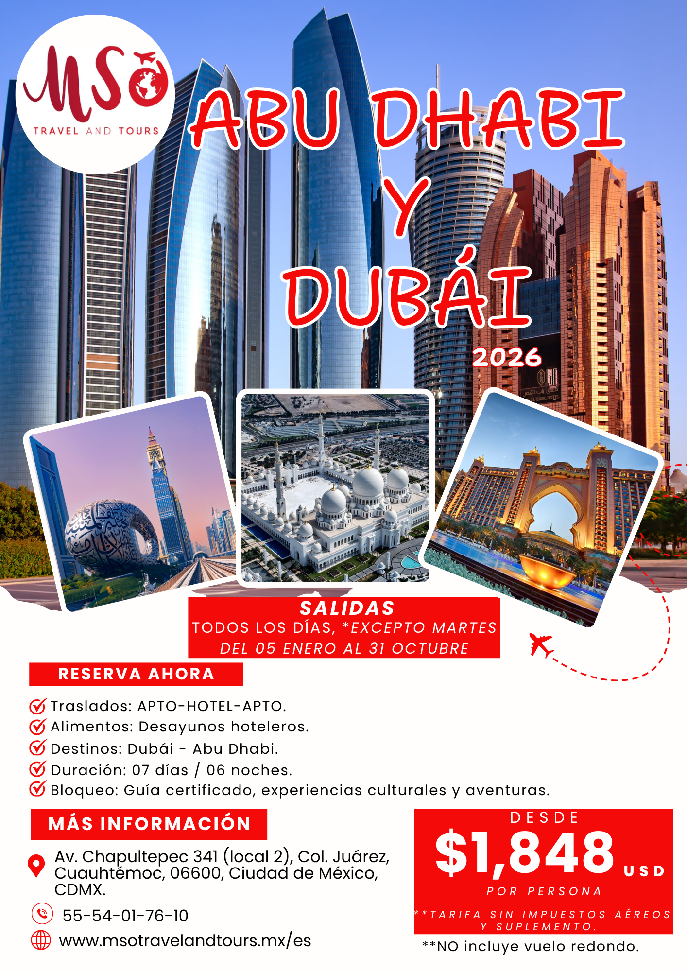Desayuno. Excursión de día completo a Abu Dhabi, capital de los Emiratos considerado el Manhattan de Medio Oriente y el centro administrativo del país. Para ir a Abu Dhabi se pasa por Jebel Ali y su Zona Franca – el puerto artificial más grande del mundo. Al llegar a Abu Dhabi, se visita la Gran Mezquita del Sheikh Zayed que es la tercera más grande del mundo con capacidad de hasta 40 mil personas. Continuar la visita dirigiéndose a la zona moderna AL BATEEN donde están Los Palacios de los Sheiks Emartis y también se pasa por el Palacio de residencia del actual Sheikh que fue igualmente residencia del Sheikh Zayed, pasamos por el Corniche de Abu Dhabi donde pueden tomar fotos panorámicas de la ciudad de Abu Dhabi, luego una panorámica por fuera del hotel “Emirates Palace” que es el hotel más lujoso del mundo de 7 estrellas, Entrada al Palacio presidencial de Qasr al Watan. Almuerzo. Entrada museo Louvre. Alojamiento.