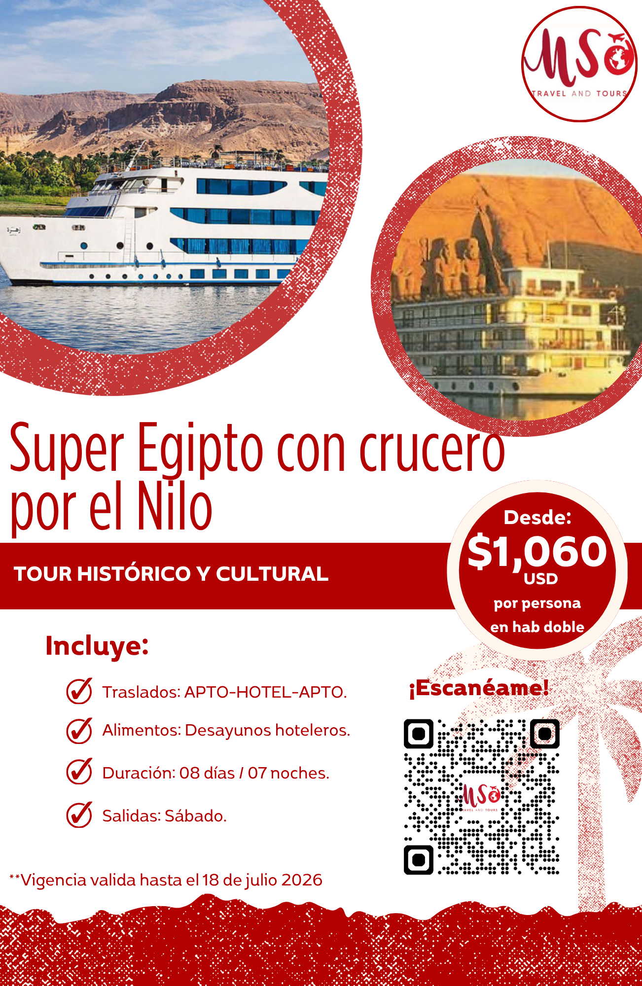 Pensión Completa a bordo. Visita a una de las antiguas canteras de granito donde los Egipcios se abastecían para sus construcciones, y donde aún se conserva sin sacar de la roca un Obelisco inacabado de 40 metros de largo y más de 1.000 toneladas. A continuación visita de la presa de Aswan, una obra faraónica que permitió controlar las inundaciones del Nilo, producir electricidad a gran escala y dió origen al lago Nasser que cuenta con una longitud de más de 500 km. Nota: A primera hora de la mañana aquellos pasajeros que lo deseen tendrán la posibilidad de realizar una excursión opcional en autocar al Templo de Abu Simbel, construido bajo el mandato de Ramses II. Gracias al extraordinario rescate llevado a cabo por la UNESCO, los dos templos cavados en la roca se transportaron 65 metros más alto y a 210 metros de su localización original , para salvarlo de las aguas cuando se creó el Lago Nasser. Las cuatro colosales estatuas de 20 metros de altura, situadas dos a cada lado de la entrada del Gran Templo, están esculpidas directamente en la montaña y representan a Ramsés II en su trono, bajo estas gigantescas estatuas encontramos estatuas más pequeñas que representan a los enemigos conquistados nubios, hititaas y libios. El templo pequeño o templo de Hathor, lo construyó Ramsés II para su mujer Nefertari, también adornado con colosos a lo largo del frontal, tres a cada lado de la entrada que representan a Ramsés y su reina Nefertari, cuatro estatuas del rey y dos de la reina, con 10 metros de altura. Por la tarde posibilidad de realizar la visita opcional de paseo en faluca por las aguas del Nilo al Templo de Philae, un hermosísimo Templo en medio del Nilo dedicado a la diosa Isis, diosa del amor. Alojamiento a bordo.