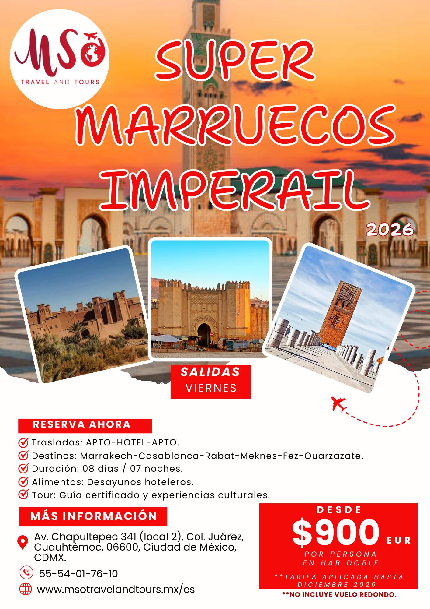 Desayuno. Salida para una visita panorámica de Casablanca, comenzando por el Boulevard de La Corniche y la carretera de la costa, por donde se llega a Anfa, distinguido barrio que destaca por sus lujosas villas. El recorrido nos llevará hacia los exteriores de la Gran Mezquita de Hassan II (opcionalmente se podrá visitar el interior de la misma). La Mezquita se ha convertido en un símbolo de la ciudad, que se eleva imponente entre Casablanca y el Océano Atlántico. Su Minarete o Torre es la estructura más alta de todo Marruecos, pudiendo ser observada desde cualquier punto de la ciudad. Este grandioso Templo es una excelente manera de acercarse a la rica cultura de Marruecos, desde su profunda religiosidad hasta el impresionante trabajo de sus artesanos. Salida por carretera a la ciudad Imperial de Rabat, capital de Marruecos y el principal centro administrativo y político del país. Visitaremos el Palacio Real, "Dar el Makhzen" y La Kasbah de los Oudaya. Continuación al Mausoleo de Mohamed V, la Mezquita inacabada y la Torre de Hassan. Por la tarde, continuación de la ruta atravesando fértiles valles hasta llegar a la ciudad de Meknes. Visita de esta ciudad Imperial con una gran cantidad de monumentos históricos y sitios naturales, tiene más de 40km de murallas defensivas y muchas mezquitas, por eso recibe el nombre de la ciudad de los minaretes. Las puertas de Bab el Mansur, Bab Berdain y Bab El-Jemis son verdaderas joyas arquitectónicas y representan la grandiosidad de la ciudad. Cada una de ellas cuenta una historia fascinante y te transporta a tiempos pasados. Pasaremos por alguna de ellas así como por el estanque del Agdal, un remanso de paz en medio del bullicio de la ciudad. Acabaremos en la plaza Bab Lahdim para continuar nuestra ruta a Fez. Llegada a Fez. Cena y Alojamiento en el hotel.
